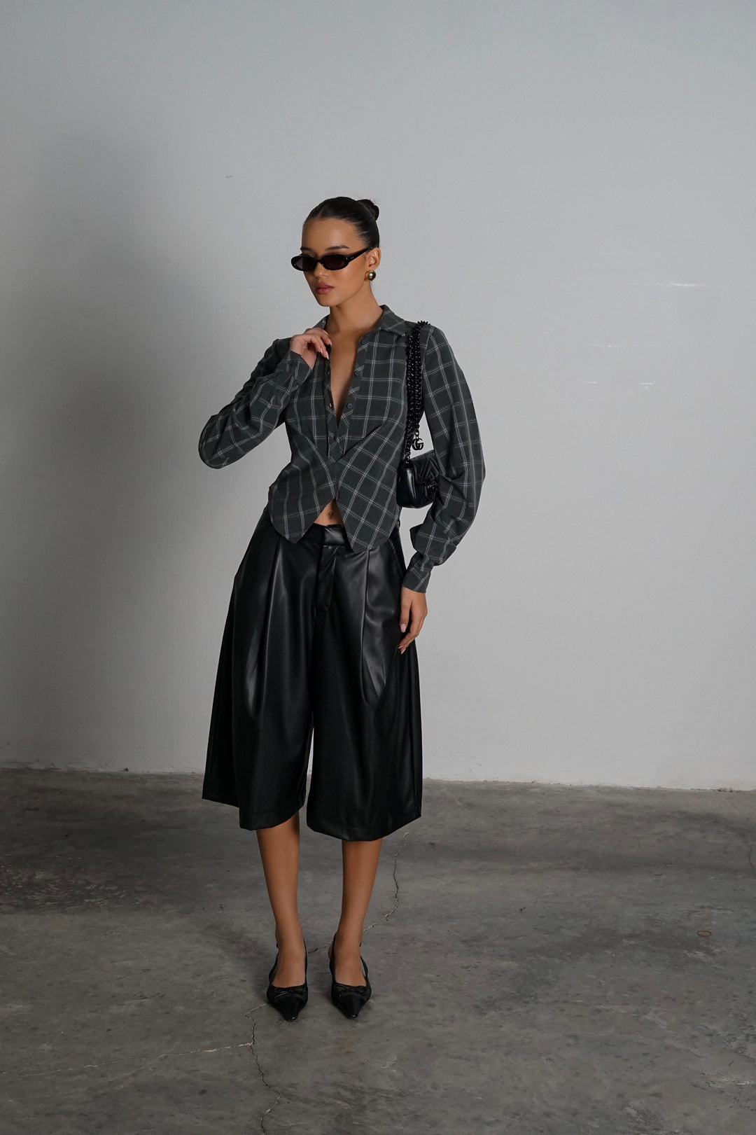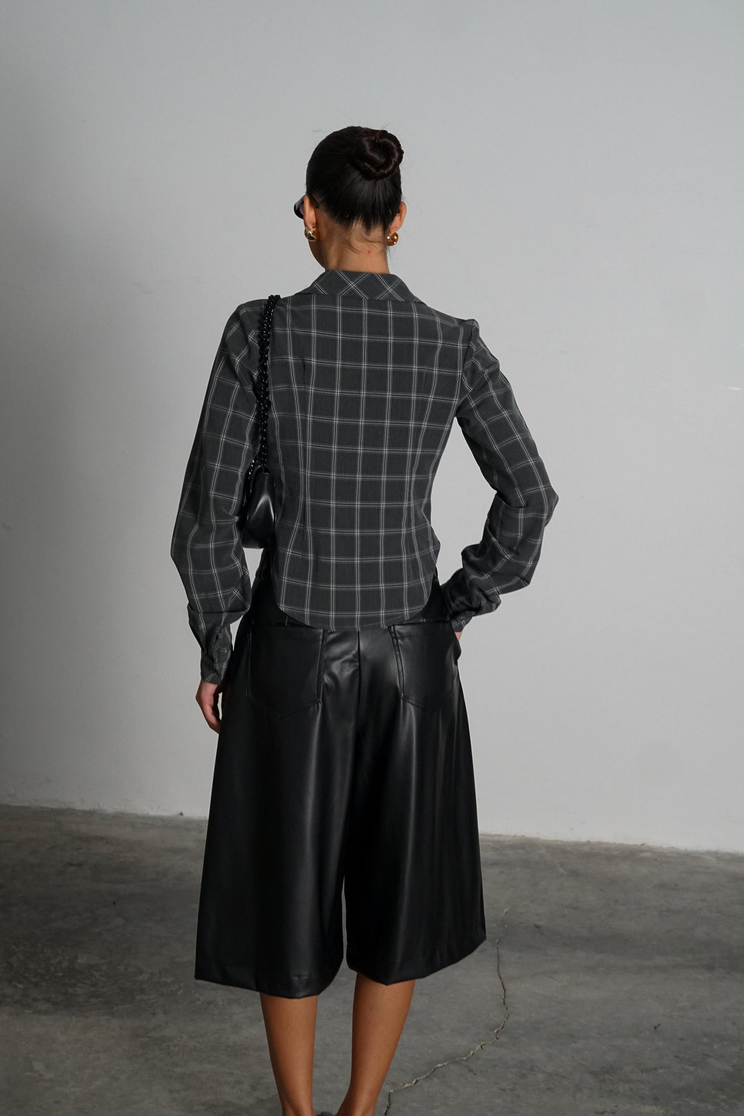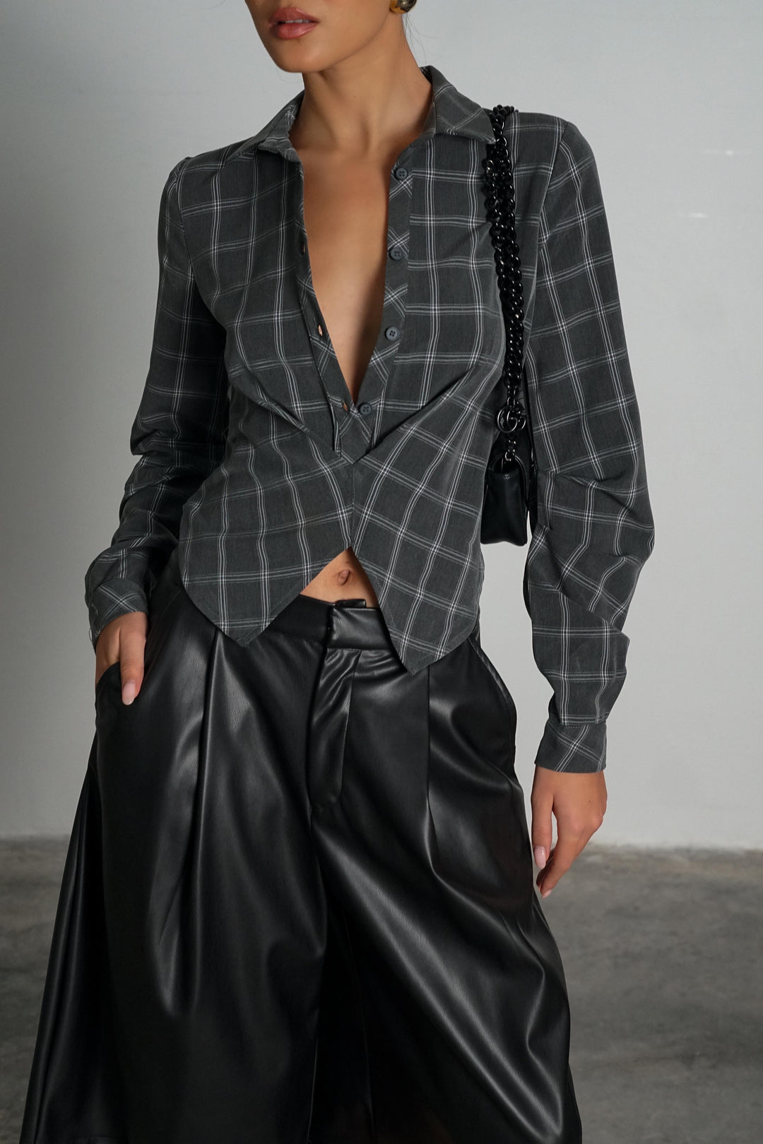 חולצת מכופתרת בגזרת סלים הדפס משבצות בד אריג ורוכסן צידי